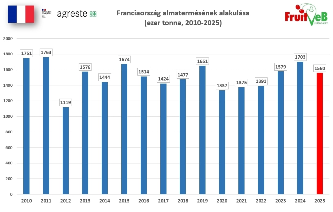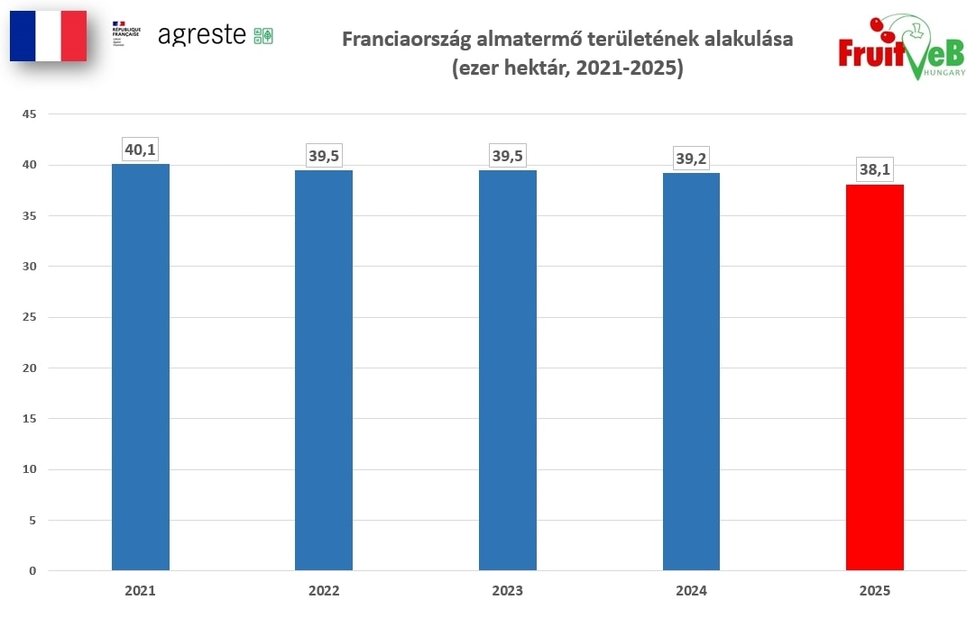 Az Agreste október 1-jén kiadott gyorsjelentése szerint Franciaország 2025-ös almatermése 1,56 millió tonna körül alakul, ami 4%-kal marad el az előző évi szinttől, ugyanakkor 6%-kal haladja meg a 2020–2024 közötti ötéves időszak átlagát. Az országos termőterület 38,1 ezer hektár, ami 1%-kal kisebb az előző évinél. A szeptemberi szezonkezdetet visszafogott piaci aktivitás és az előző évhez képest alacsonyabb árak jellemezték.