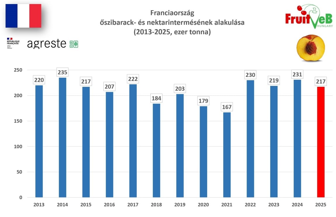 Az Agreste szeptember 1-jén kiadott, végleges adatsora szerint a 2025-ös termőévben 217 ezer tonna őszibarackot takarítottak be Franciaországban, ami 8%-kal marad el a tavalyi, 231 ezer tonnás volumentől, de még így is igen közel maradt a 2020-2024-es ötéves időszak átlagához. Az idei évben a jégesők, hőhullámok, a tavaszi fagyok és esőzések, valamint a levéltetvek fokozott kártevőnyomása miatt a visszaesés minden termőterületet érintett, de a Rhône-völgyben volt a legmarkánsabb.