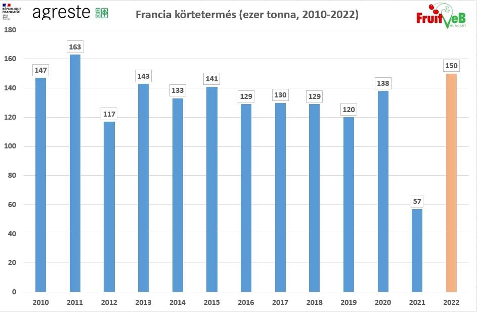 Az Agreste október végén kiadott előrejelzése szerint az idei évben 143 ezer tonna körüli francia körtetermés várható, ami jóval több, mint a duplája, csaknem háromszorosa a tavalyi súlyosan fagykáros termésnek, és csaknem 20%-kal múlja felül az előző öt év átlagát. Az Európára becsült 20%-os növekedés a körtetermesztésben elsősorban Olaszországban következik be, ahol 2021-hez képest várhatóan megduplázódik a termésmennyiség, míg Portugáliában és Spanyolországban jelentős csökkenés várható (-26%, illetve -17%).