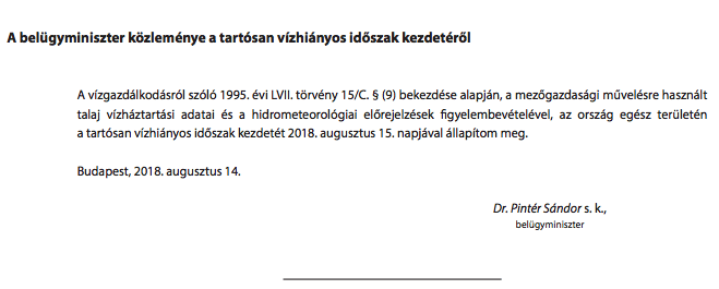 A Hivatalos Értesítő 2018. augusztus 14. számában megjelent közlemény alapján Pintér Sándor Belügyminiszter 2018. augusztus 15-től tartósan vízhiányos időszakot állapított meg. A vízgazdálkodásról szóló 1995-ös törvény értelmében a vízhasználónak nem kell vízkészletjárulékot fizetnie ebben az időszakban. A tartósan vízhiányos időszak végét a hidrometeorológiai előrejelzések figyelembevételével szintén a Hivatalos Értesítőben teszik majd közzé.