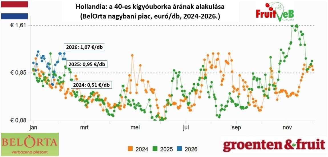 A holland és belga aukciókon a belföldi termésű uborka ára már meghaladja az 1 eurót (396 Ft/kg), ami 0,25–0,30 euróval magasabb, mint az előző év azonos időszakában. A termelők jövedelmezősége azonban jelentős regionális eltéréseket mutat: Hollandia déli részén a kedvezőbb téli fényviszonyok miatt jobb minőségű tételek kerültek piacra, míg az északi termőtájakon gyengébb volt a természetes fényellátottság.
