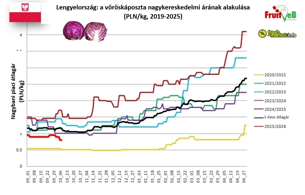 A vöröskáposzta esetében már a főszezon kezdetétől fogva jelentősen elmaradt az átlagár az előző négyéves időszak átlagától. Ellentétben a fehér káposztával, szeptember folyamán nem következett be további áresést, sőt, a hónap végén még enyhe áremelkedést lehetett látni, így a vöröskáposzta nagybani árai jellemzően a 0,90–1,00 PLN/kg közötti tartományban alakultak (82–91 HUF/kg).