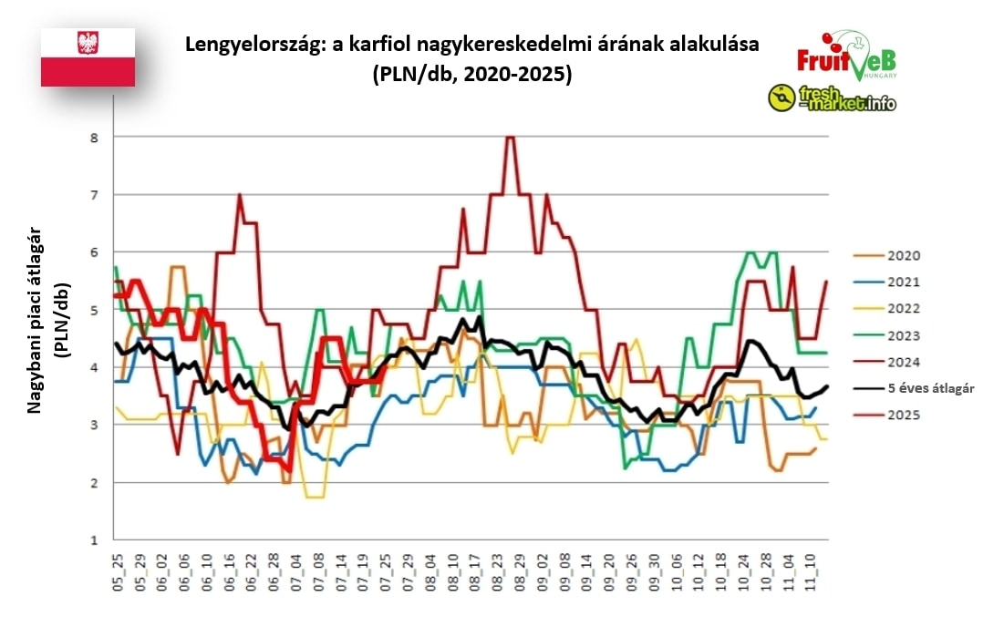 Lengyelországban a karfiol ára július második felében enyhe csökkenést mutatott, mivel azonban csaknem rekordszintről következett be ez az áresés, még mindig az ötéves átlagárat közelíti a jelenlegi szint.