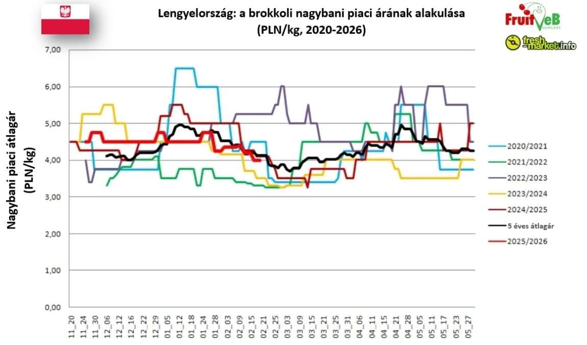 Mindezek alapján nagy valószínűséggel folytatódik a brokkoli lengyel nagykereskedelmi árainak csökkenése. Ezt erősíti a spanyolországi helyzet is, ahol az elmúlt napokban tovább mérséklődtek az árak: a tegnapi nagykereskedelmi aukciókon 0,24–0,48 EUR/darab (94–188 Ft/darab) között alakultak. Bár a rendkívül csapadékos időjárás jelentős károkat okozott a termőterületeken, a helyi források szerint a brokkoli- és karfiolállományokban nem keletkeztek számottevő károk, így az ellátás fennmaradása további árnyomást gyakorolhat az európai piacokra. Ezért a jelenlegi folyamatok alapján a lengyel brokkolipiacon a következő hetekben is inkább lefelé mutató ártrend valószínűsíthető.