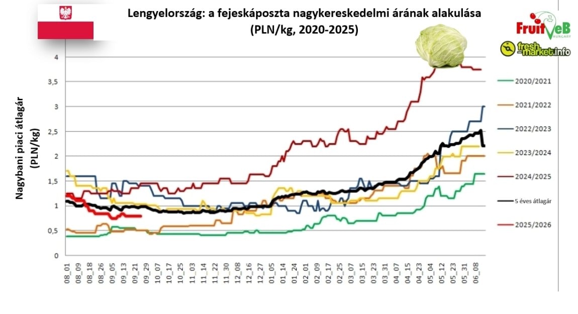 A mostani 0,80 PLN/kg (75 Ft/kg) körüli átlagos árszint 18%-kal alacsonyabb az előző öt szezon átlagánál és 2 százalékkal a tízéves átlag alatt marad. A jelenlegi káposztaárak messze elmaradnak az előző három szezontól, amikor szeptember folyamán az árszint 1,03-1,45 PLN/kg (95-135 Ft/kg) között alakult.
