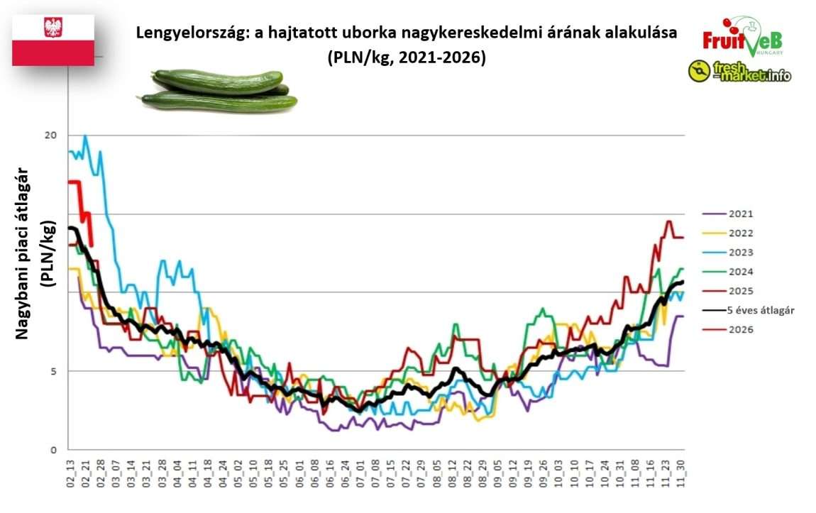 Ennek megfelelően a lengyel nagybani piacokon a hónap közepétől folyamatosan mérséklődött az import uborka ára, tíz nap alatt mintegy 25%-os csökkenés jelentkezett, így jelenleg a 9,00–12,00 PLN/kg (836–1115 Ft/kg) közötti sávban mozognak az árak. A hazai piac több országból érkező importtal versenyez, ezért a lengyel árak mozgása általában gyorsabban és erőteljesebben követi a nemzetközi trendeket, mint a spanyol.