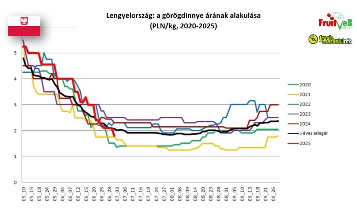 Május közepe óta folyamatosan csökken az import görögdinnye ára a lengyel nagybani piacokon, és ez a folyamat június végén sem állt meg. Jelenleg a görögdinnye nagybani piaci átlagára az 1,6-2,0 PLN/kg (150-190 Ft/kg) sávban mozog, ami 1,8 PLN/kg (170 Ft/kg) átlagárat jelent – ez 22%-kal alacsonyabb árszint, mint az előző évben, és az utóbbi 5 évet tekintve a második legalacsonyabb ár.