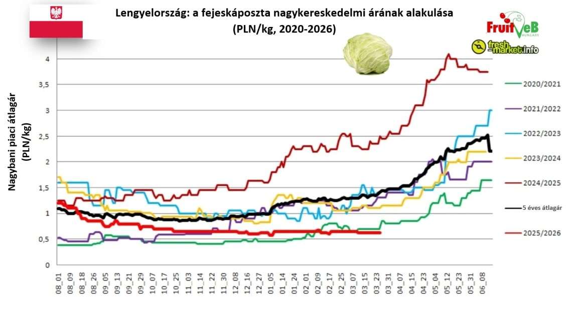 Lengyelországban a káposzta piaca hetek óta meg se moccan, a lengyel szaklapok szerint “a klinikai halál állapotában van”, márciusban a nagybani piaci ár az előző öt év legalacsonyabb szintje alá süllyedt. A jelenlegi árszint egyre jobban eltávolodik az előző évek szezonális trendjeitől, és a különbség várhatóan tovább nő, mivel semmi nem utal arra, hogy a közeljövőben javulna a helyzet.