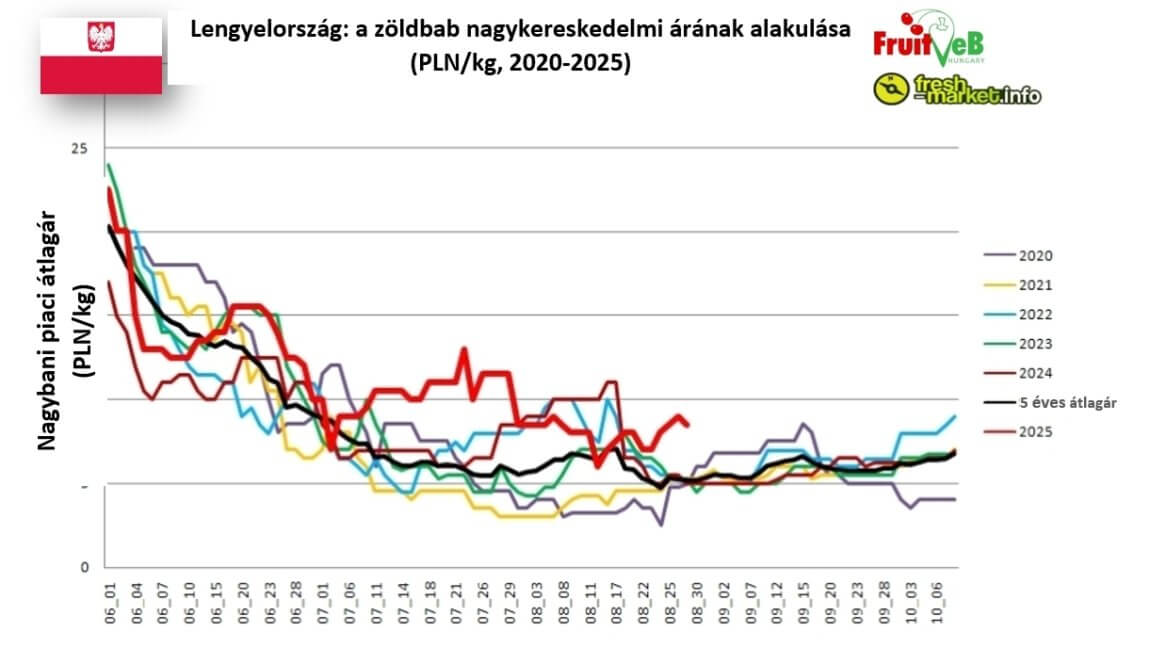 Szeptember elején a zöldbab nagybani ára 7,00-10,00 PLN/kg (650-930 Ft/kg) között mozog, a minőségtől és régiótól függően, ami 65%-kal magasabb, mint az elmúlt öt szezon átlagára. Mivel a kínálat még mindig szűkös, felvetődik a kérdés, hogy rövid távon lehet-e számítani árcsökkenésre?