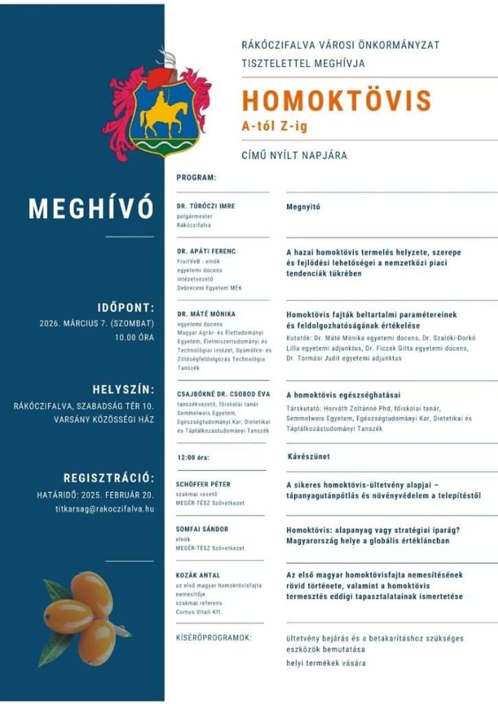 Rákóczifalva Városi Önkormányzat tisztelettel meghívja Önt “Homoktövis A-tól Z-ig” című szakmai rendezvényére.