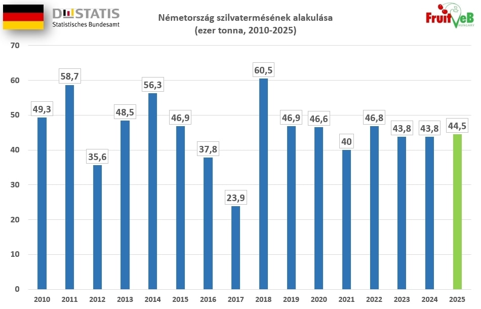 A Német Szövetségi Statisztikai Hivatal (Destatis) előzetes becslése szerint az idei belföldi szilvatermés volumene 44,5 ezer tonna lesz, ami 700 tonnával (+1,6%) lesz magasabb, mint a 2024-es évben betakarított mennyiség, illetve az elmúlt tízéves átlag (mindkettő 43,8 ezer tonna).