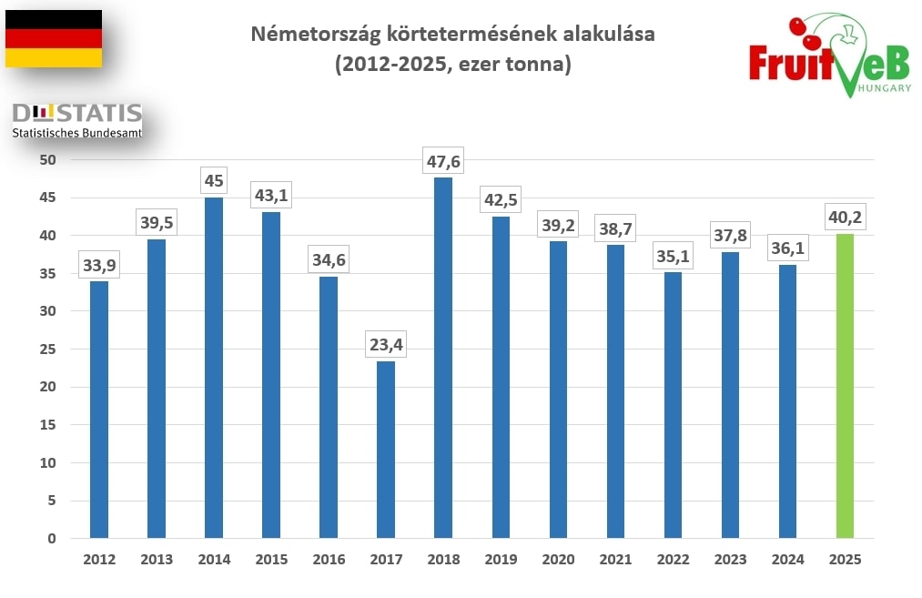 A Destatis prognózisa szerint a 2025-ös német körtetermés volumene 40,2 ezer tonna körül alakul majd, ami 3,1%-kal haladja meg az előző évi mennyiséget, és 5,6%-kal, (2100 tonnával) múlja felül az előző tízéves időszak átlagát.