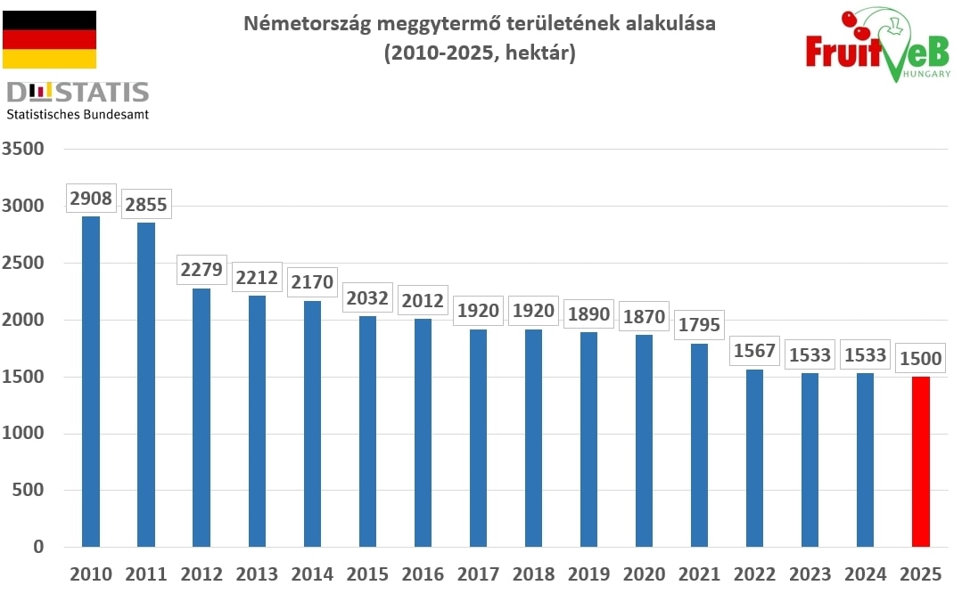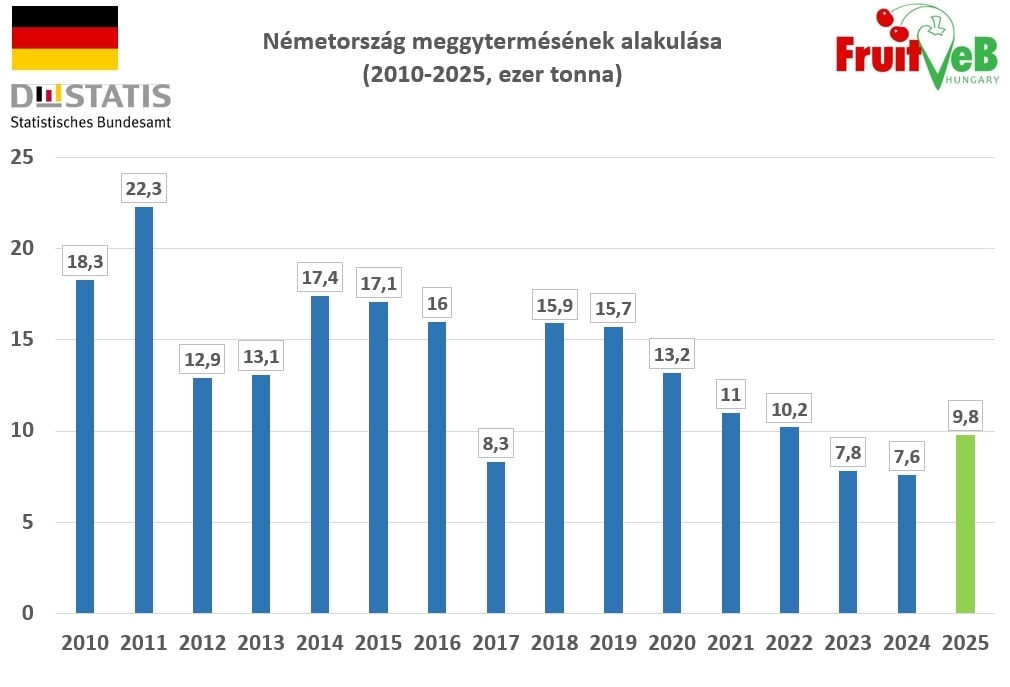 A Destatis végleges adatai szerint a 2025-ös termőévben Németország meggytermése 9800 tonna lett, ami 31,3%-kal meghaladta ugyan a tavalyi, mindössze 7500 tonnás mennyiséget, de még így is csaknem 20%-kal elmaradt az előző tízéves időszak átlagától (12300 tonna). Ezt az átlagot a következő években sem lesz könnyű elérni, mivel a német országos termőterület mérete az utóbbi évtizedben 2000 hektárról 1500 hektárra csökkent, ami 25%-os zsugorodásnak felel meg.