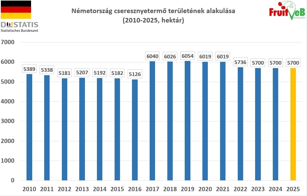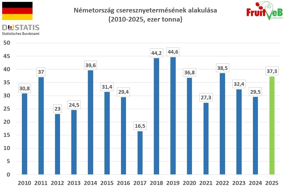 A Destatis 2025-ös évre vonatkozó, immár végleges adatai szerint az idei német cseresznyetermés volumene 37,3 ezer tonna lett, ami 9400 tonnával, azaz 33,6%-kal haladja meg a kifejezetten gyenge termőév eredményét. Az előző 10 szezon 32,9 ezer tonnás átlagot képest az idei volumen 4400 tonnával, vagyis 13,3%-kal múlja felül. A jó termés okai között szerepel, hogy a virágzás időszakában enyhe időjárás volt tapasztalható, és a legtöbb termőtájat elkerülték a fagykárok és a jégesők is.