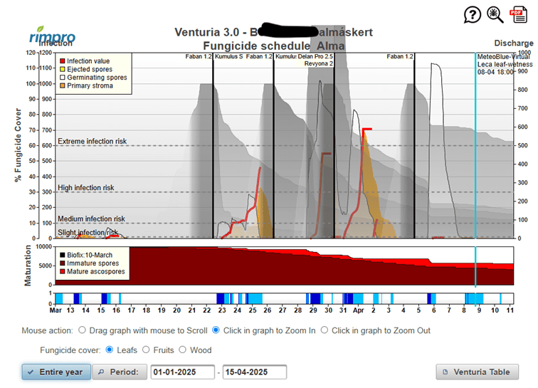 - Idővonal grafikon: Múlt, jelen és jövőre vonatkozó kockázatelemzés. Előre tervezhető permetezések a meteo előrejelzésre alapozva kiszámítja a fertőzés esélyét a következő napokra.