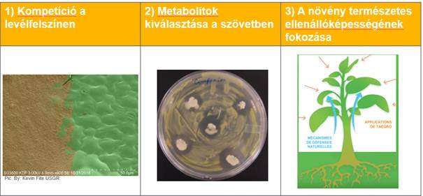 - A levélfelületen elszaporodva nem engedi meg a kórokozónak, hogy megtapadjon. Kiszorítja a felületről. A kórokozó nem képes behatolni a levélszövetbe. Olyan anyagokat (metabolitokat) választ ki, amik gátolják a kórokozók fejlődését.