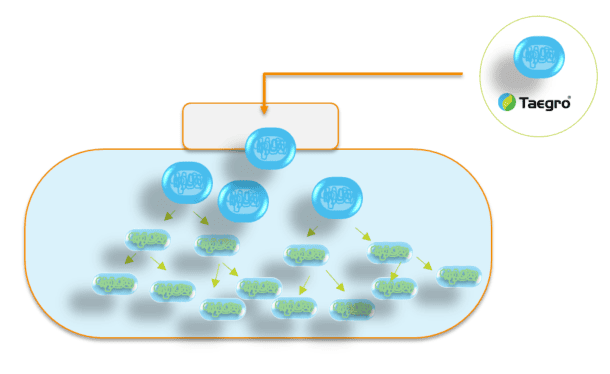 - A Taegro a permetléhez adva azonnal szaporodásnak indul és a koncentrációja exponenciálisan növekszik. A szaporodásnak köszönhetően sejtláncokat hoz létre, ami sok százezer sejt összekapcsolódását jelenti. Ezt permetezzük ki a lombfelületre. Tovább szaporodik a lombfelületen, és a folyamat során, több fronton is „szembeszáll” a kórokozókkal.