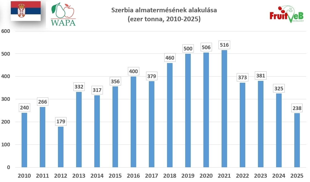 Szerbia almaágazata az elmúlt évtizedben drámai változásokon ment keresztül. Az ország korábban évente közel 500 ezer tonna almát termelt, ez azonban mára jelentősen lecsökkent.